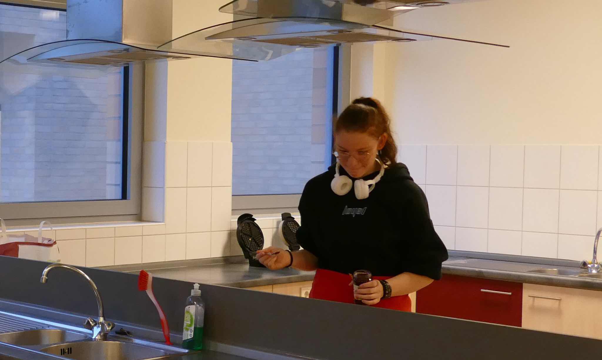 Am Tag des Verkaufs treffen wir uns schon vor Unterrichtsbeginn in der Schule und fangen mit den Vorbereitungen an. Bevor wir starten Brötchen zu schmieren oder die Waffeleisen zu benutzen, müssen jedoch zuerst die Hygienevorschriften eingehalten werden. Dazu zählen gründliches Händewaschen, Haare zusammenbinden, Schürzen umbinden und Handschuhe anziehen. Erst wenn das alles geschehen ist, geht’s los.