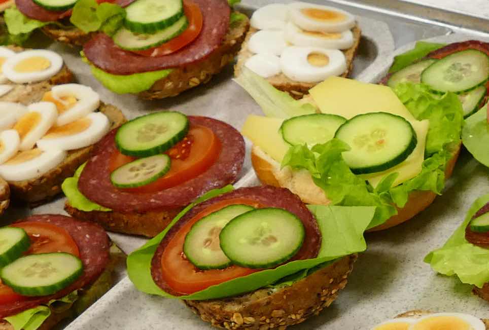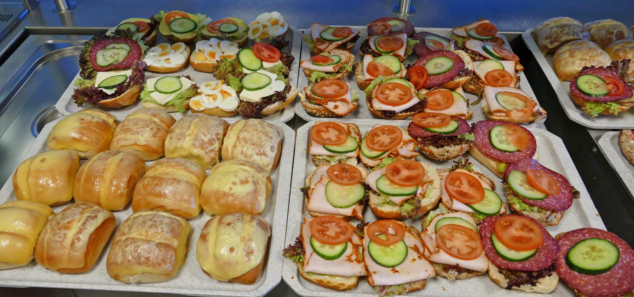 Während die einen Brötchen belegen, haben andere die Aufgabe, den Verkaufsbereich vorzubereiten. Wenn dann um 9:15 Uhr die Pause beginnt, hat jeder eine Position und Aufgabe. Drei bis vier Personen, die ihre Schürzen und Handschuhe anbehalten, werden dem Verkauf zugeteilt. Drei weitere Mitarbeiter unserer Firma achten als Security darauf, dass es kein Gedrängel gibt, sich alle gut benehmen und nach dem Kauf den Verkaufsbereich zügig verlassen.